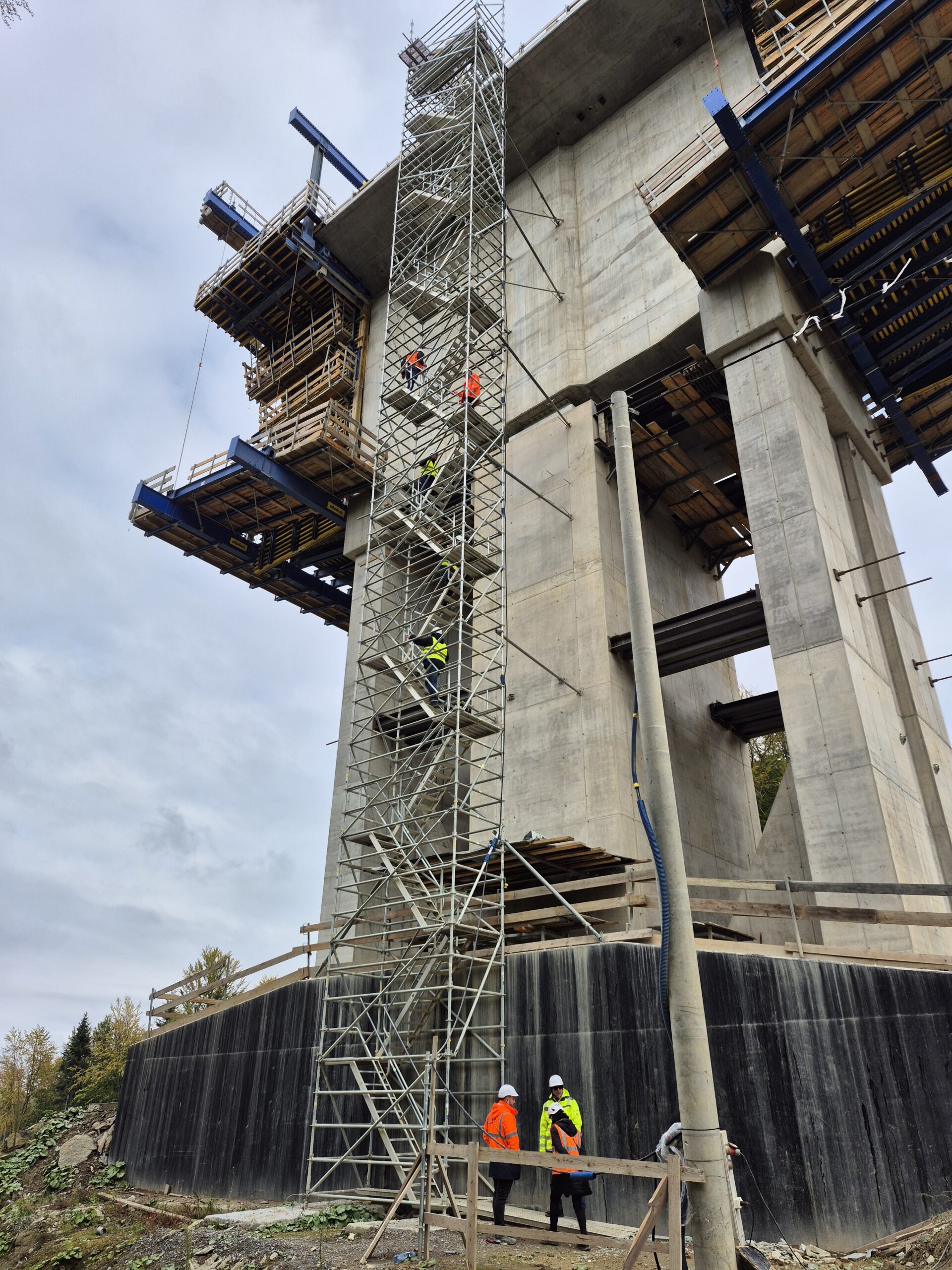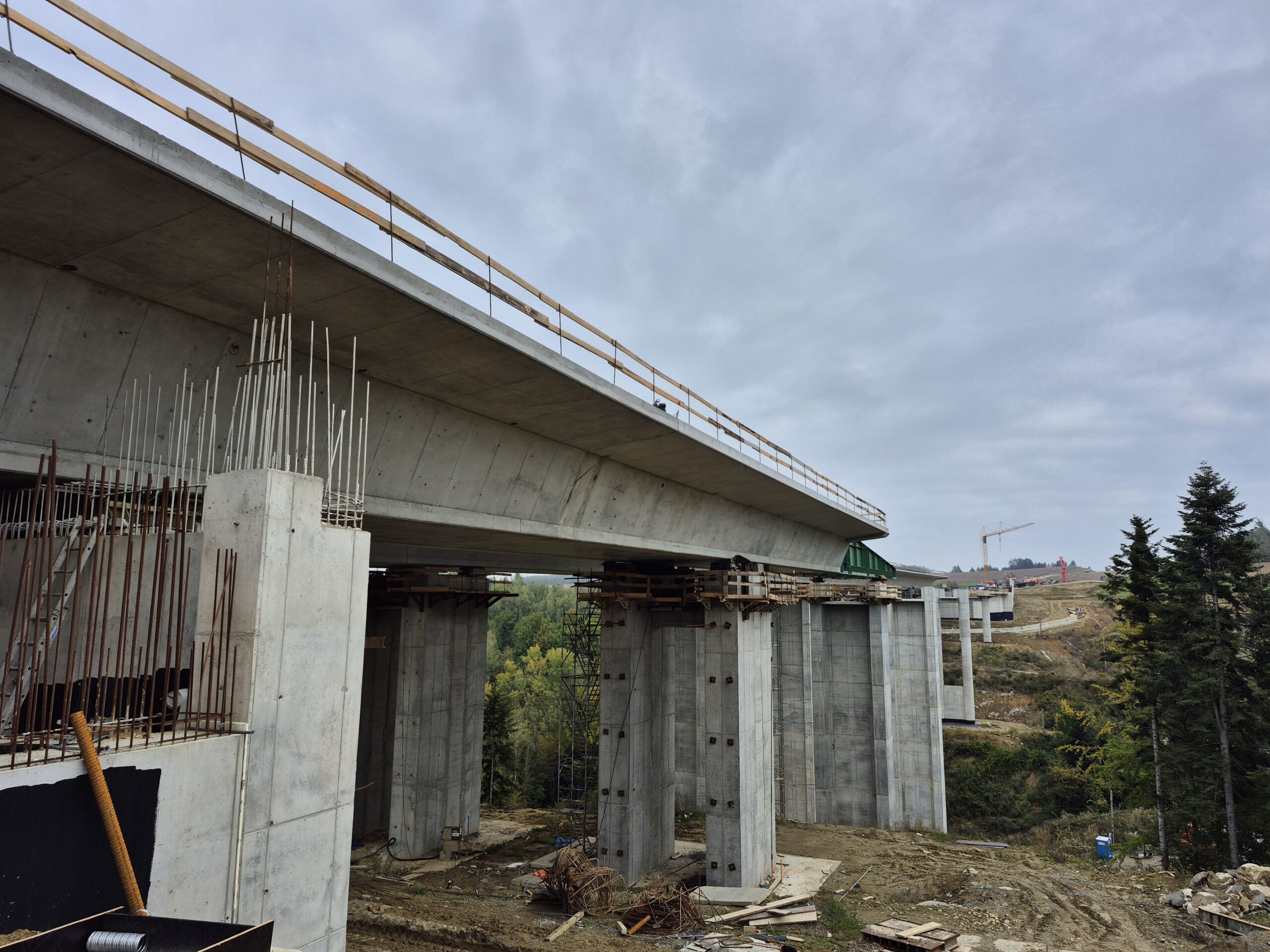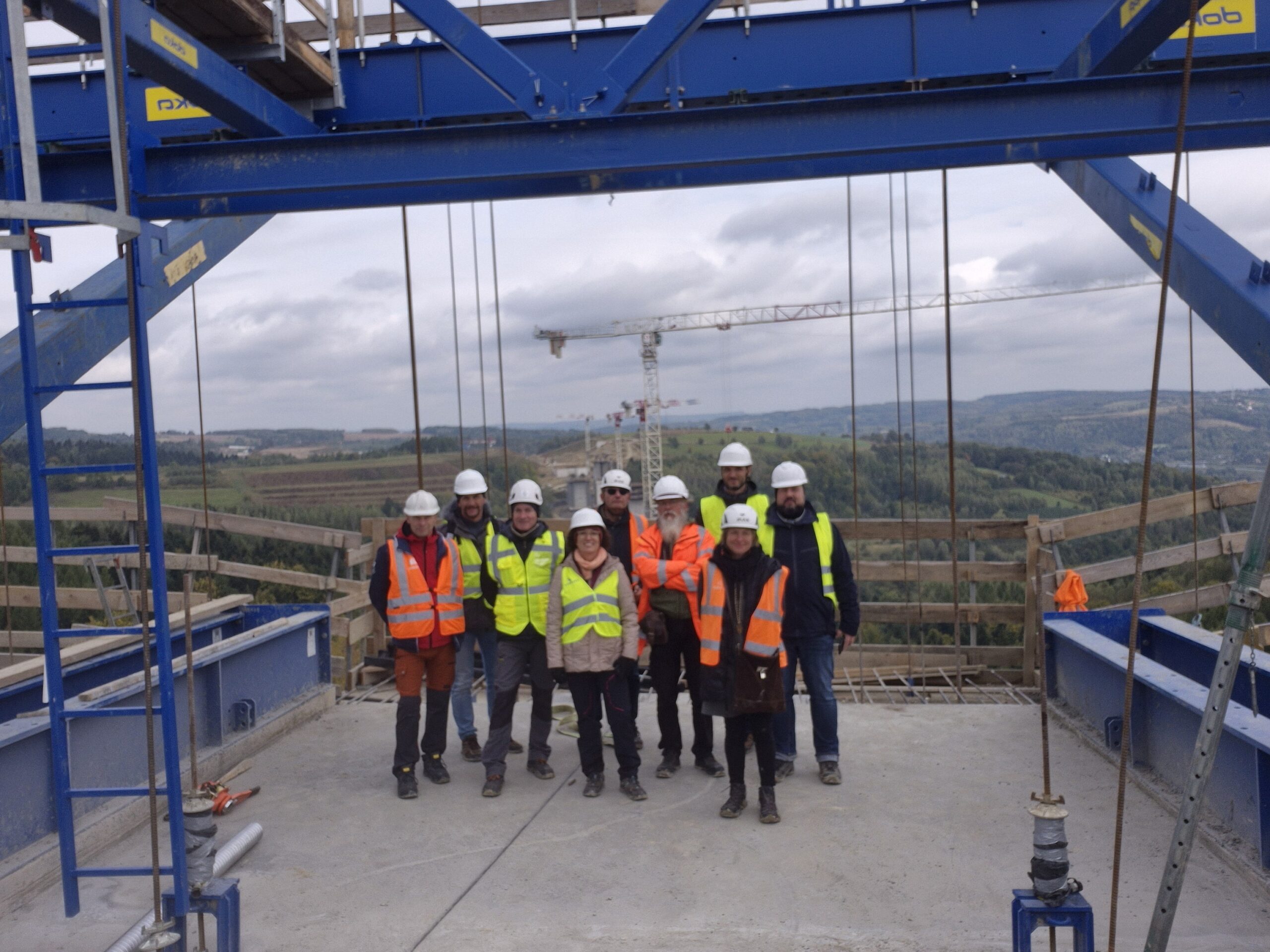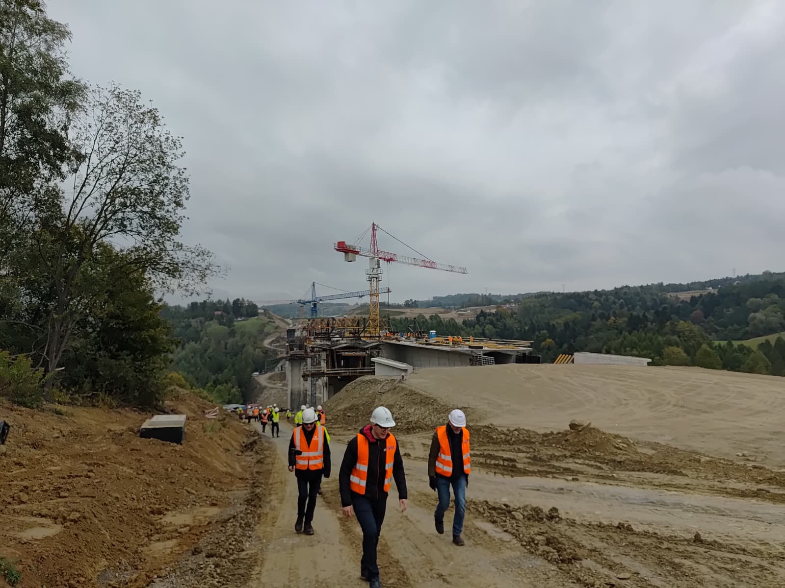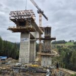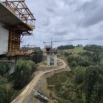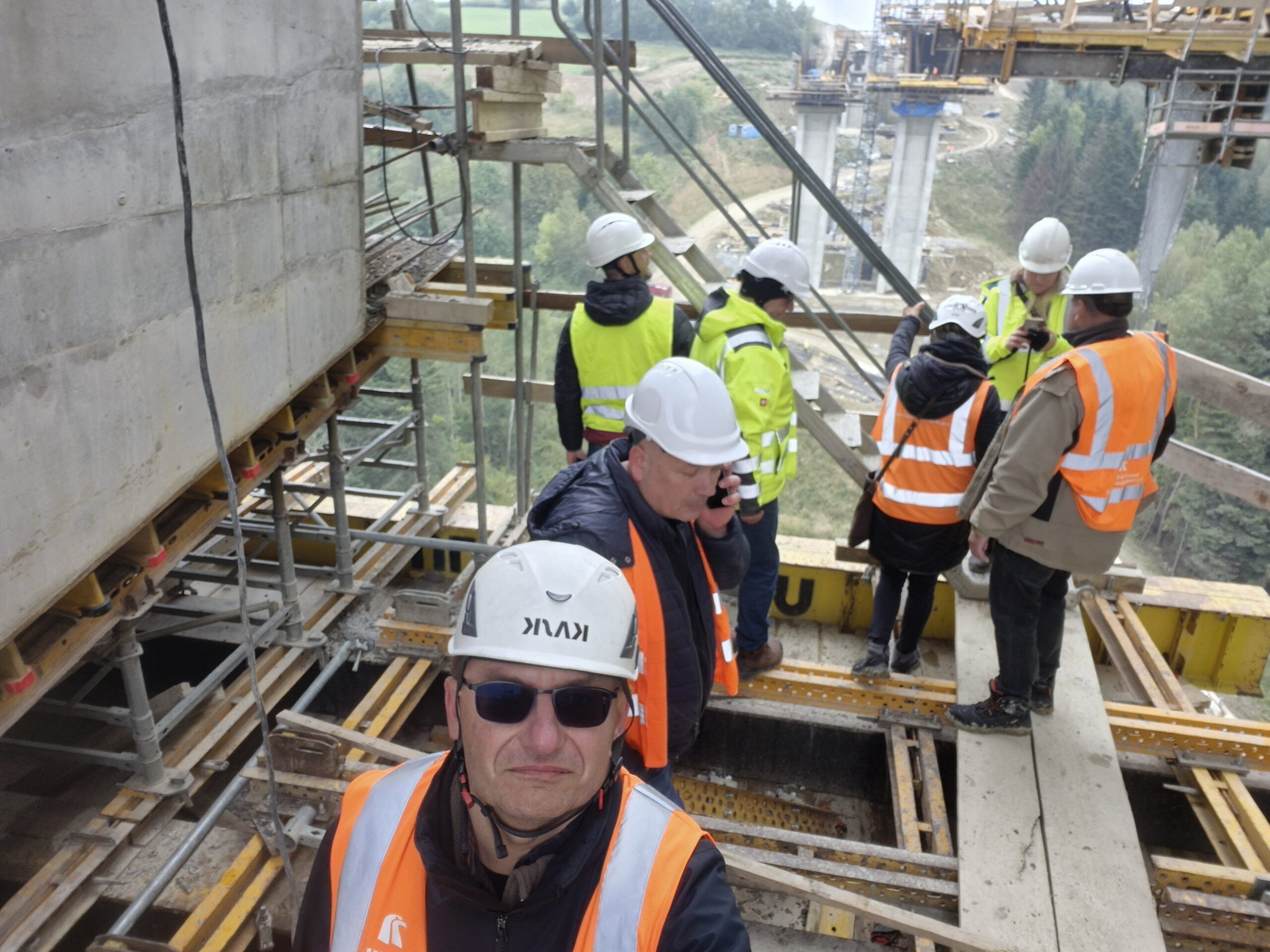Kolejnymi obiektami, z którymi mogliśmy się zapoznać były estakady długości 460 m i 1080 m realizowane metodą nawisową. Niezapomnianym przeżyciem dla „odważnych” uczestników wycieczki, była możliwość wyjścia po schodni na oba budowane obiekty, w tym na wysokość blisko 80 m realizowanej dłuższej estakady. Z wysokości konstrukcji można było nacieszyć oko realizowanymi obiektami oraz przepięknymi krajobrazami otaczającymi budowę. Kierownik budowy omówił wszystkie trudnościach realizacyjne związane z budową tak dużych obiektów i udzielił wyczerpujących informacji na wszystkie nurtujące nas pytania. Ponadto obecni na budowie przedstawiciele biura projektowego opowiedzieli o całym procesie przygotowania dokumentacji projektowej oraz o problemach z jakimi zmagali się w trakcie projektowania.