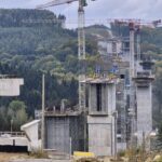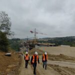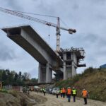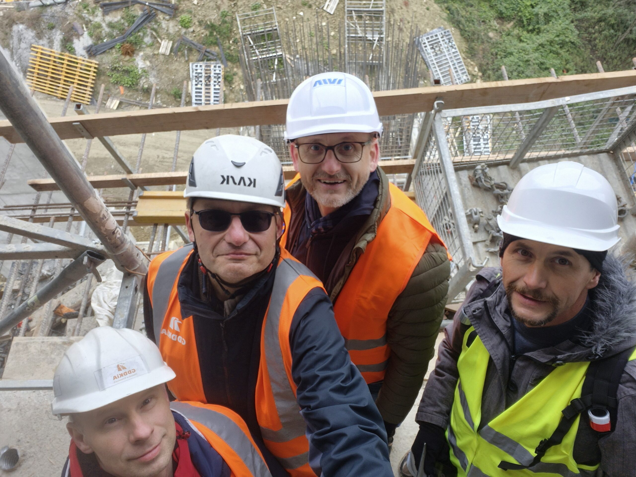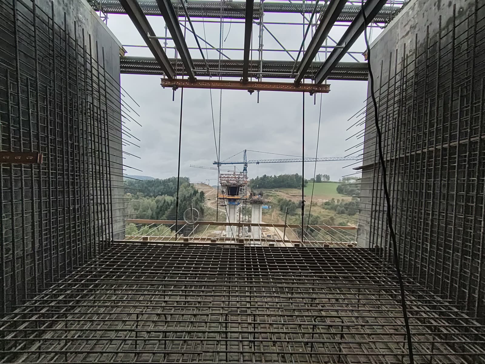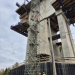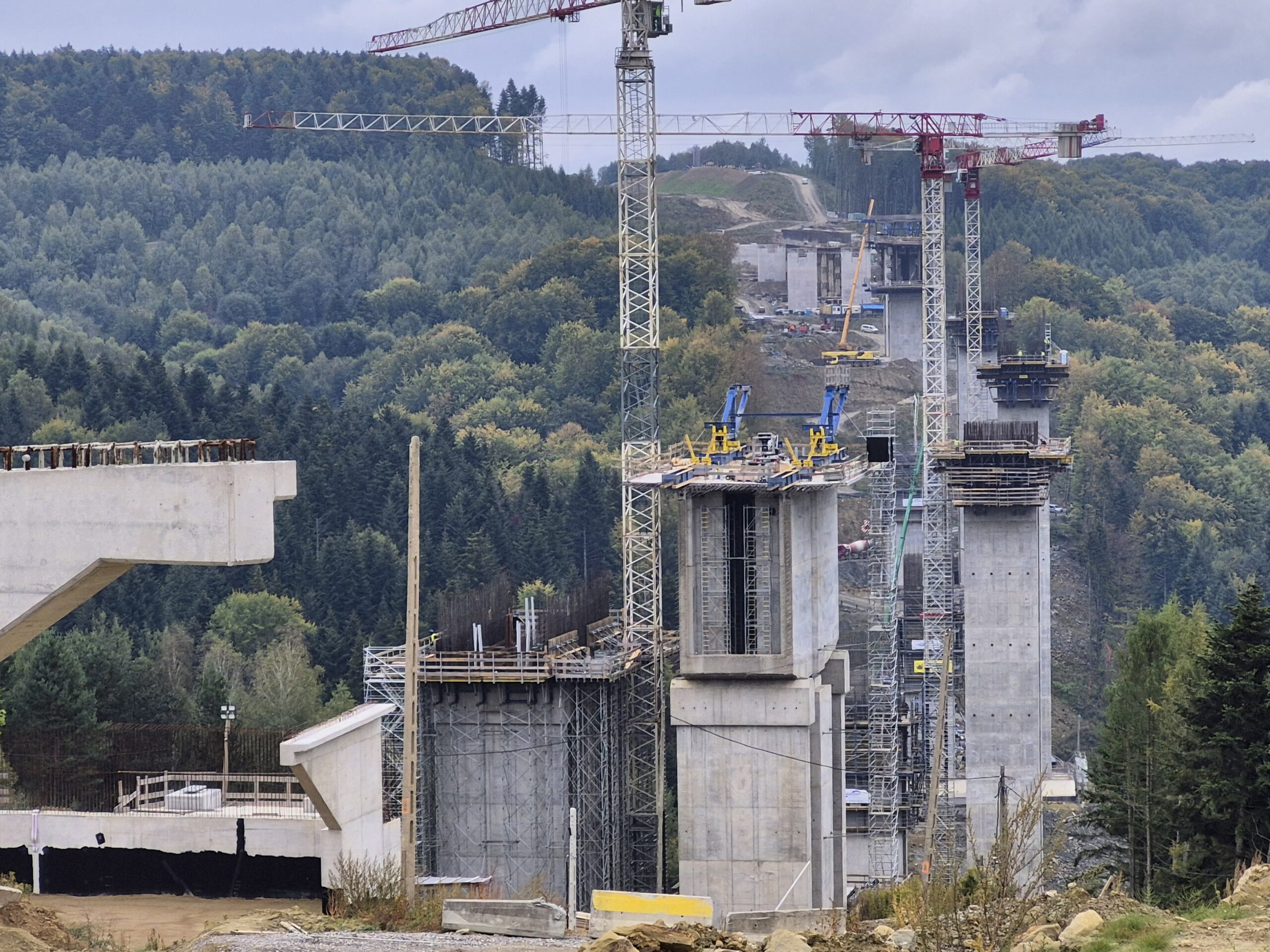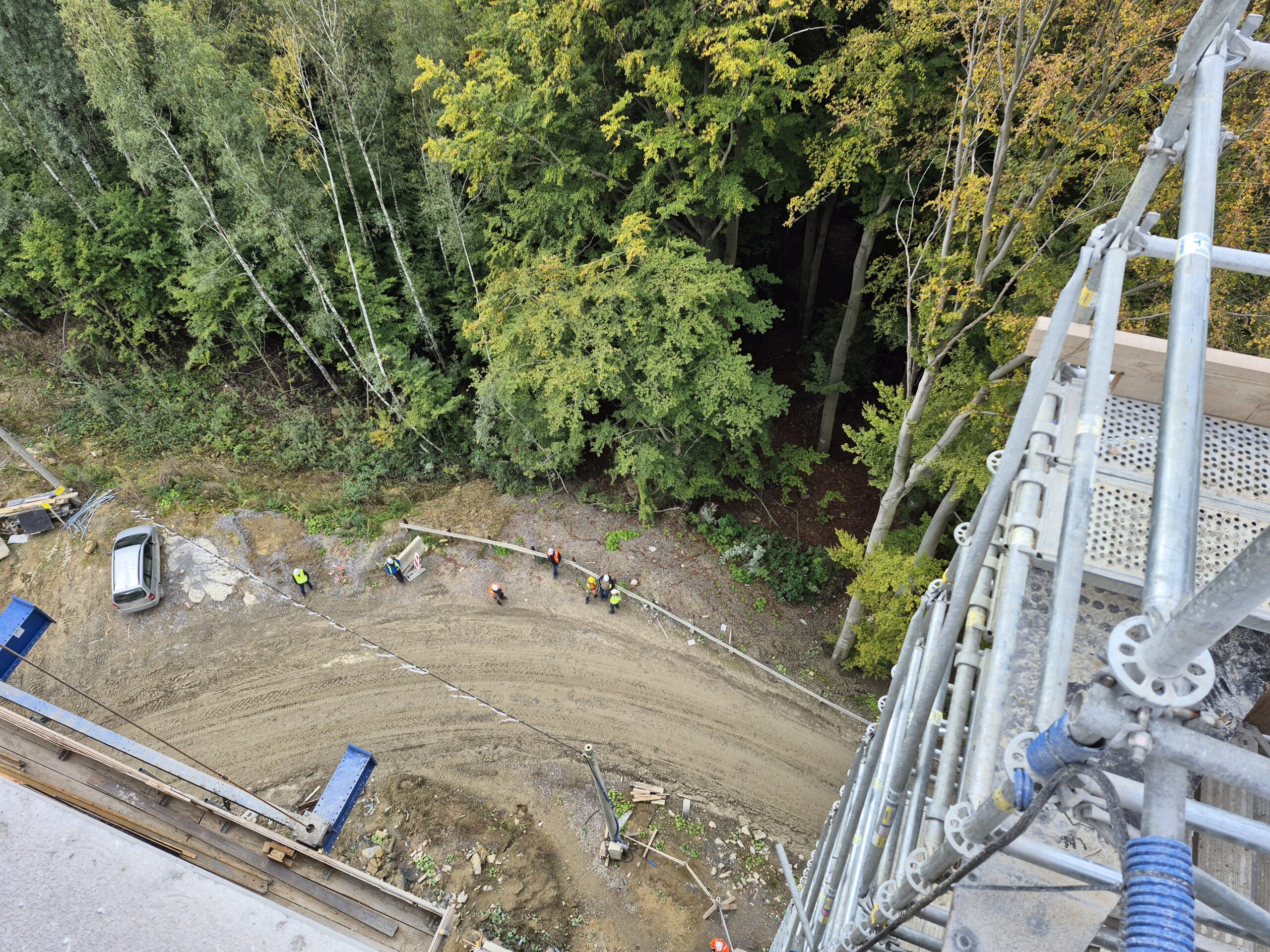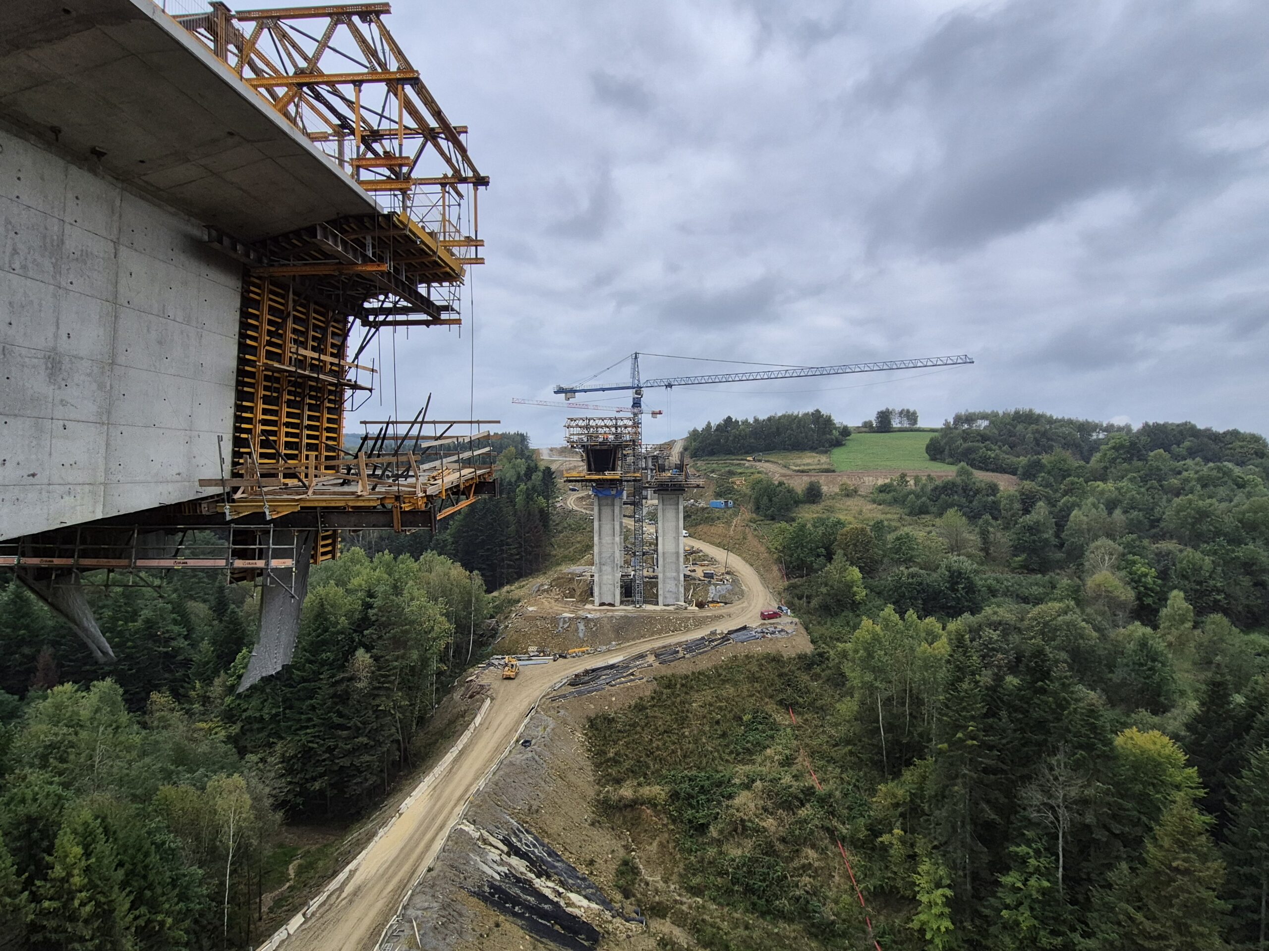Kolejnymi obiektami, z którymi mogliśmy się zapoznać były estakady długości 460 m i 1080 m realizowane metodą nawisową. Niezapomnianym przeżyciem dla „odważnych” uczestników wycieczki, była możliwość wyjścia po schodni na oba budowane obiekty, w tym na wysokość blisko 80 m realizowanej dłuższej estakady. Z wysokości konstrukcji można było nacieszyć oko realizowanymi obiektami oraz przepięknymi krajobrazami otaczającymi budowę. Kierownik budowy omówił wszystkie trudnościach realizacyjne związane z budową tak dużych obiektów i udzielił wyczerpujących informacji na wszystkie nurtujące nas pytania. Ponadto obecni na budowie przedstawiciele biura projektowego opowiedzieli o całym procesie przygotowania dokumentacji projektowej oraz o problemach z jakimi zmagali się w trakcie projektowania.