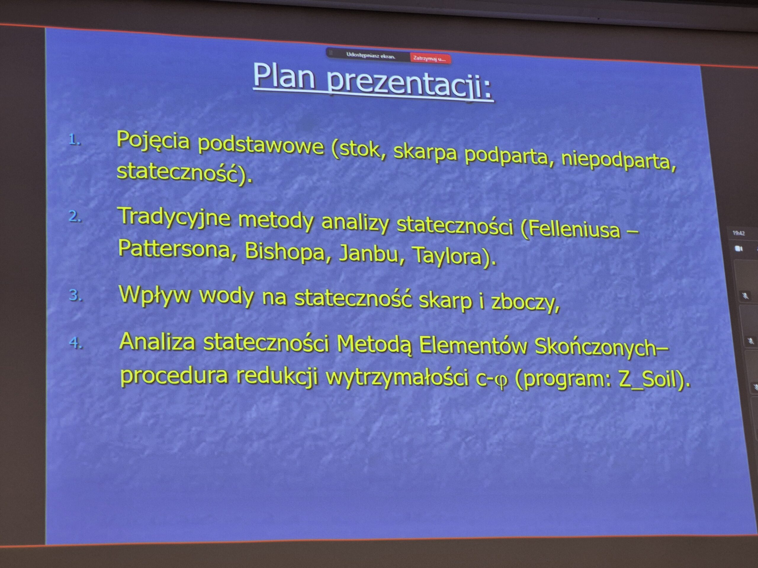 Pan Profesor w przystępny sposób przedstawił podstawowe pojęcia związane ze statecznością skarp i zboczy. Następnie omówił tradycyjne metody analizy stateczności oraz wpływ wody na stabilność skarp i zboczy. W dalszej części zaprezentował zastosowanie metody elementów skończonych (MES) w analizie stateczności, wskazując jednocześnie zalety i ograniczenia zarówno metod tradycyjnych, jak i MES.